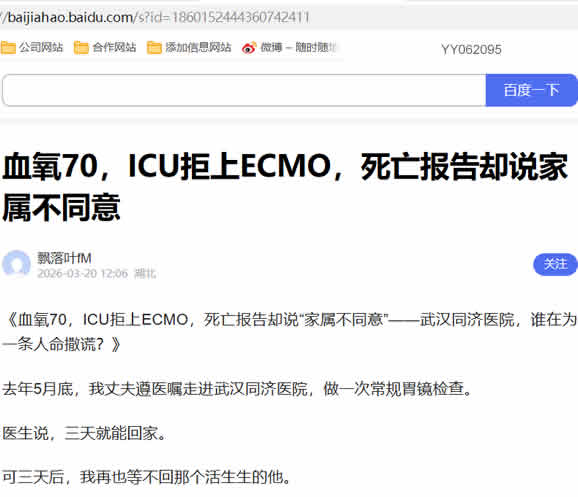 《血氧70,ICU拒上ECMO,死亡报告却说“家属不同意”——武汉同济医院,谁在为一条人命撒谎?》