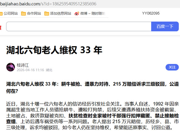 近日,湖北十堰一位六旬老人的信访经历引发社会关注。当事人自述,1992 年因亲属超生被当地工作人员错抢耕牛、遭殴打拘禁,后续又遭遇养殖扶持资金被截留、土地被占、救济款疑被克扣、扶贫检查时全家被村干部强行扣押藏匿、禁止接触检查组、上访后遇车祸受伤等一系列问题。老人提出 215 万元赔偿,历经乡、县、市三级处理,诉求均被驳回,如今老人仍在坚持维权,希望能还原事实、讨回公道。
